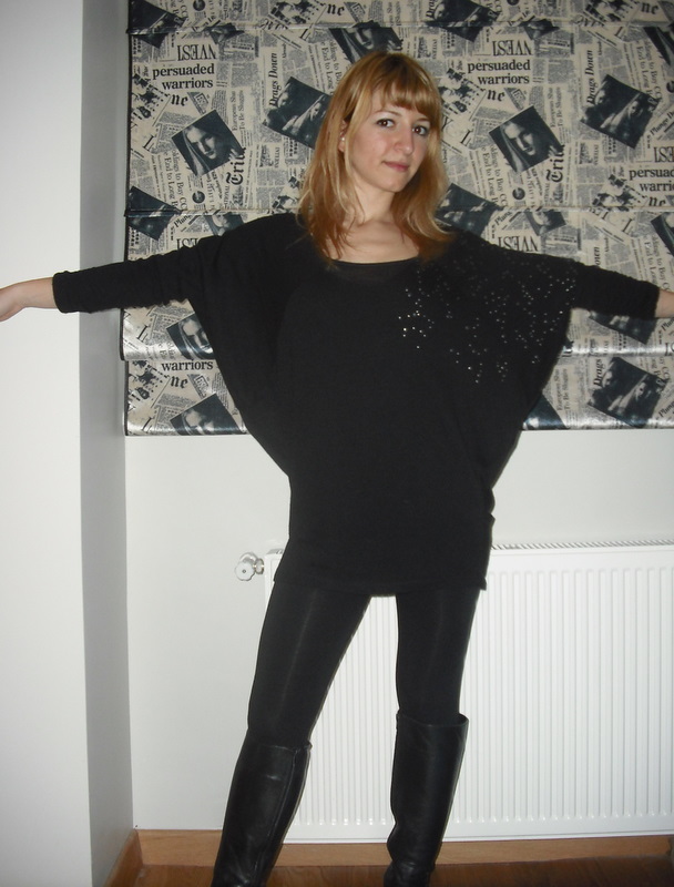 Yarasa kollu, omuzu zımbalı tunik kazak. Koton'dan alınmıştır, gıcır gıcırdır. Aslında L beden bir kazaktır, ancak ben böyle modellerin biraz bol ve uzun daha güzel olduğu taraftarıyım. O yüzden S-M bedenler tunik, L bedenler kazak olarak kullanabilir. 15 TL'dir.
