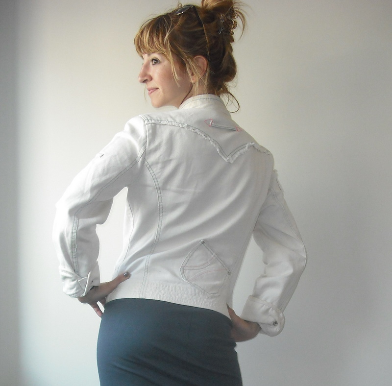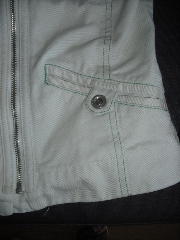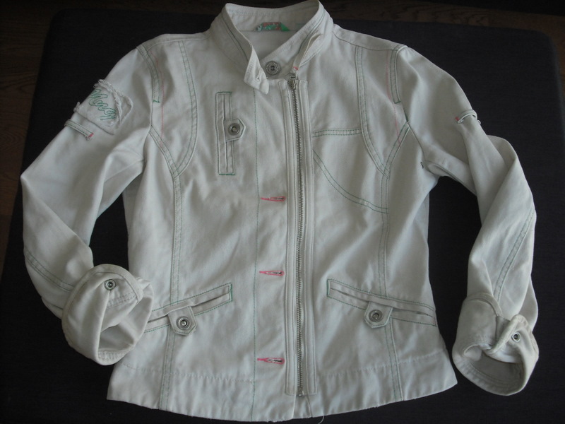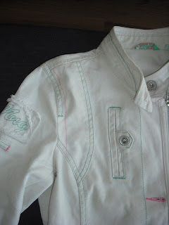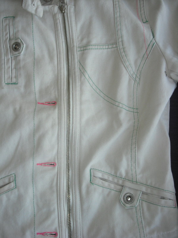 Rengarenk dikişleri olan krem rengi ceket. Tam baharlık veya serin geçen yaz akşamları için ideal. Elbiselerin üzerinde de çok tatlı durur, kot cekete güzel bir alternatif. Dikiş detayları ve cepleri çok güzeldir: