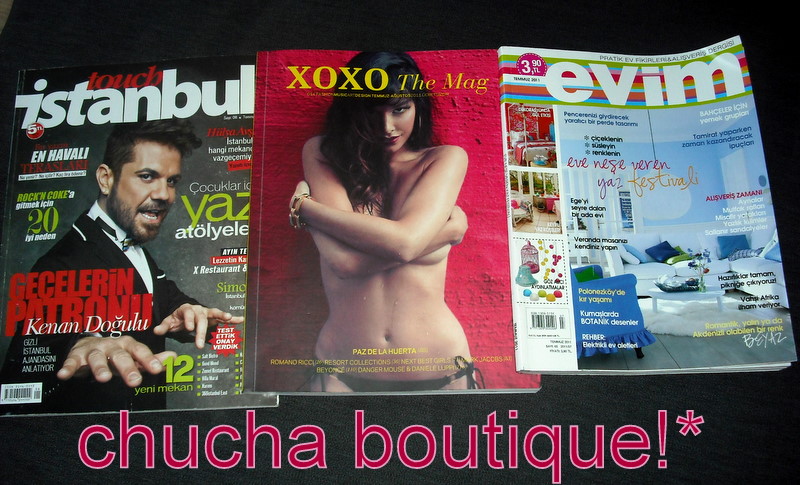 Herhangi bir ürün tipi veya fiyat sınırlaması yok. Bu aralar Chucha Boutique'ten alışveriş yapana Touch İstanbul, Evim veya XOXO The Mag dergilerinden birinin Temmuz 2011 sayısı bizden hediye ;) Öperiz!*